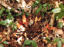 この植物はツチトリモチ科の寄生植物で、塊状の地下茎でトベラやシャリンバイなどの樹木の根に寄生する。全体が淡黄色で、高さ10~15センチメートル、一見キノコ類と見まちがえる。キノコの頭のように見える部分は微小な雌花の集団で、雄花はその間に点々とまじる。