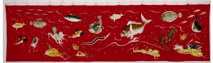 江戸後期に制作された万屋町傘鉾垂が長崎刺繍「魚尽くし」であるのは、この町にかつて魚問屋があったことに因む。刺繍は文政10年(1827)縫屋幸助(下絵・原南嶺斎)による作品と、弘化5年(1848)塩屋熊吉による作品の新旧二種が存在する。