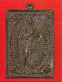 青銅製方形プラケット(大型メダル)で無原罪の聖母を表わしている。長辺11センチメートル、短辺7センチメートルで、四隅に天使の顔があり、フランシスコ会の帯が周囲に陽刻されている。ド・ロ神父の遺品の中にあったもので、外海地方の信者が潜伏時代に伝承したものと思われる。スペイン製で16~17世紀に日本に伝来し、キリスト教布教時には聖母マリアに対する信心を育てるために広く使われていたものである。