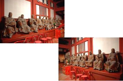 左右に並ぶ十八羅漢は中空の寄木造で麻布を置き漆で固めたもの、延宝5年(1677)羅漢奉加人数という巻物が三尊の胎内から発見されたことと、唐僧南源(なんげん)の手紙に唐仏師三人が崇福寺で羅漢を造るとあるので、24年の隔たりがあるが、この三人が徐潤陽ほか2名ではないかと疑うこともできる。どれもみな中国人仏師の作で当時を示す貴重な作例である。