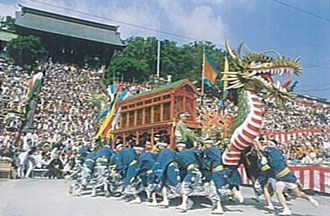 中国の竜頭船を形どった豪華な龍船で、屋根が開いて舞台となるのが特徴である。演技は、先曳きの幼児一傘鉾一踊り子と地方(本踊り)一龍船入場となり、屋根を開いた舞台で本踊り-広場と屋根舞台で本踊り一龍船の回転と反転となる。船には子ども14名が乗り、7つ拍子の囃子で船を前後進させたり、回転させたりする。楽器は、大太鼓・銅鑼・鼓板・大蓮葉鉦・中蓮葉鉦・小蓮葉鉦・小鉦の7つである。