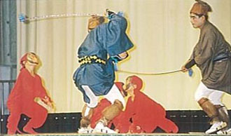 笛・太鼓・鉦の拍子に合わせて、立道具・ササラの踊りが出て、その後、根治平、与五郎の掛け合いになり、それから3匹の猿の踊りとなる。