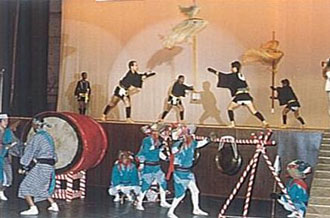 世話人入場後、笛・太鼓・鉦の音に合わせて、立道具が踊りながら入場、その後から、鬼の面を被ったササラが踊りながら入場し、次に掛け打ちが入場し太鼓を叩き踊る。最後に婦人の扇子踊りがある。