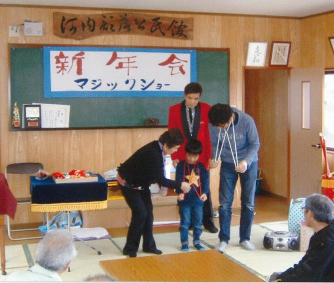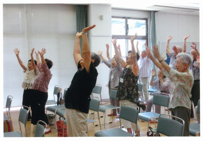 【活動の様子】 (みんなで体操、一緒にマジック、ヘルシー料理の講座)