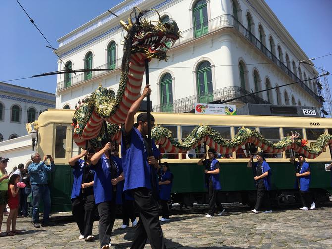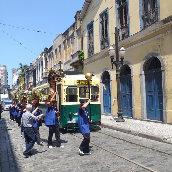 路面電車・龍がサントス港到着。パウロ・バルボサ市長臨席のもとサントス市での路面電車・龍のお披露目会開催。 |