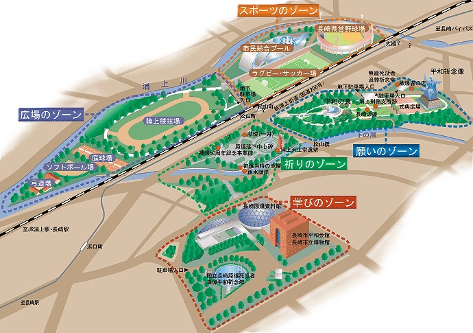 平和公園の東地区は、祈念像地区、中心地地区、長崎原爆資料館地区のそれぞれを「願いのゾーン」「祈りのゾーン」「学びのゾーン」と位置づけ、3地区の一体性、連続性に配慮した整備を行いました。西地区は「スポーツのゾーン」として、市民総合プール、ラグビー・サッカー場、野球場(県営)を再整備するとともに、陸上競技場の周辺を「広場のゾーン」と位置づけ、将来的にはスポーツレクリエーションも楽しめる交流の広場として計画しています。原爆の悲惨さを訴え、平和を願う心を育て、ふれあいながら平和の大切さを実感する。平和公園は、時代を超えて平和の尊さを発信する拠点として、また新たな歴史を刻みはじめています。