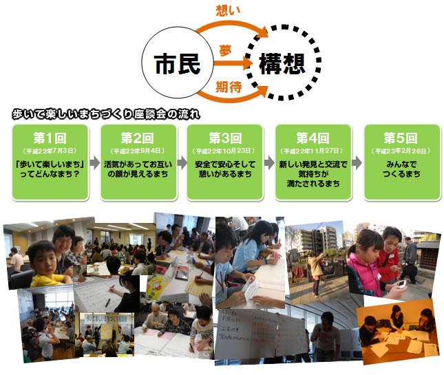 『歩いて楽しいまちづくり構想』をつくる主役はもちろん市民の皆さんです。そこで、策定にあたっては、多くの市民の皆さんの声をいただくために「歩いて楽しいまちづくり座談会」を開催しました。座談会は全5回。平成22年7月に第1回を開催して以来、楽しく意見交換をしたり、時にはまちに飛び出しまちの魅力を再発見したりしながら議論を進めてきました。参加者数は実に1,000人超。この構想は多くの市民の皆さんのリアルな声と夢、願いが詰まっています。