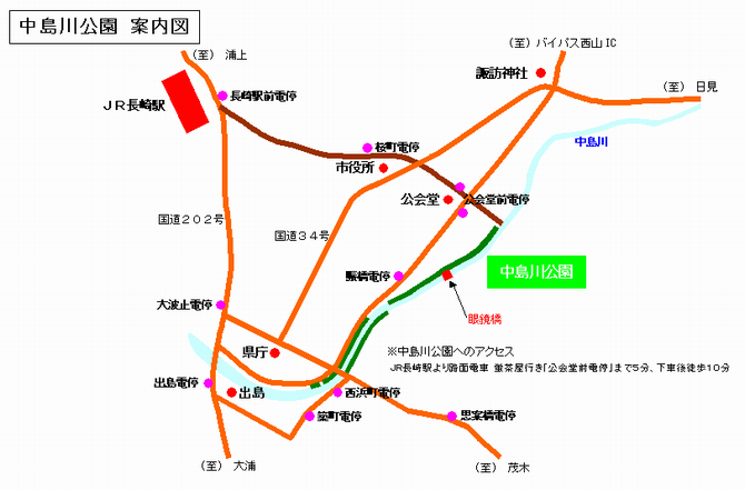 市内中心部を流れる中島川沿いにある公園で、すぐ側には日本最古の石造りアーチ橋である眼鏡橋をはじめ、多くの石橋群が架かり多くの観光客で賑わいます。