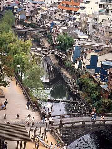 市内中心部を流れる中島川沿いにある公園で、すぐ側には日本最古の石造りアーチ橋である眼鏡橋をはじめ、多くの石橋群が架かり多くの観光客で賑わいます。