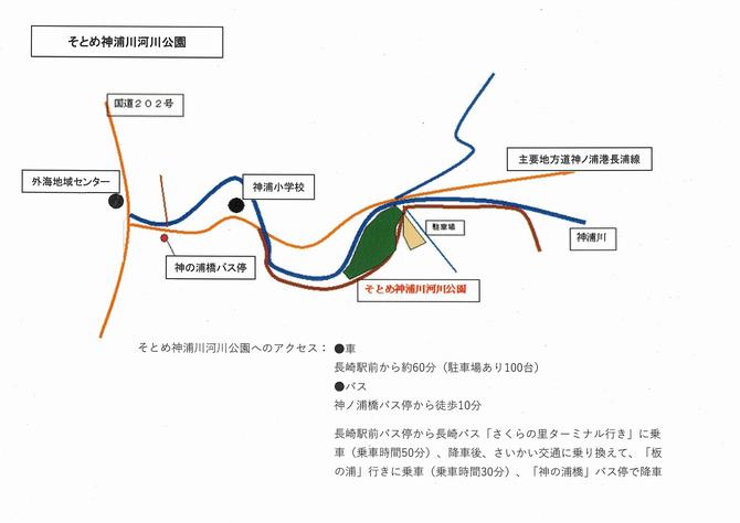 長崎駅から 長崎バス 桜の里ターミナル行き終点まで50分下車後 さいかい交通 に乗り換え 板浦行き神浦橋バス停まで30分、下車後徒歩10分。