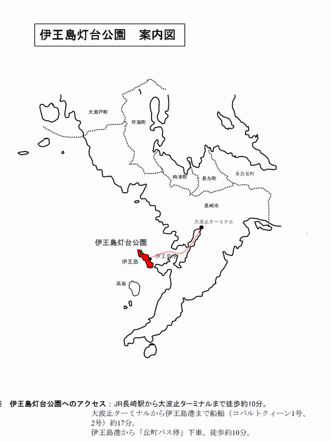 長崎駅から大波止ターミナルまで徒歩約10分。大波止ターミナルから伊王島港まで船舶(コバルトクィーン1号、2号)約19分。伊王島港より長崎バス 島内周回バスにて丘町バス停まで15分、下車後徒歩約10分。