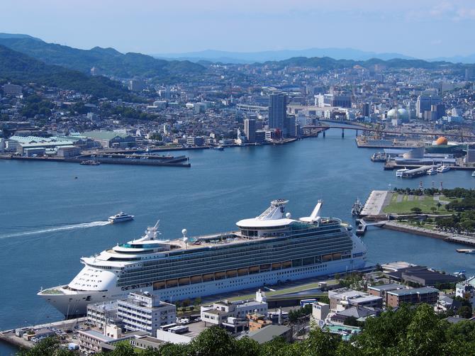 また、長崎港に入港する大型クルーズ船を眺めたり、世界遺産「明治日本の産業革命遺産」の構成資産になっている三菱長崎造船所のジャイアント・カンチレバークレーンなどを見ることができます。