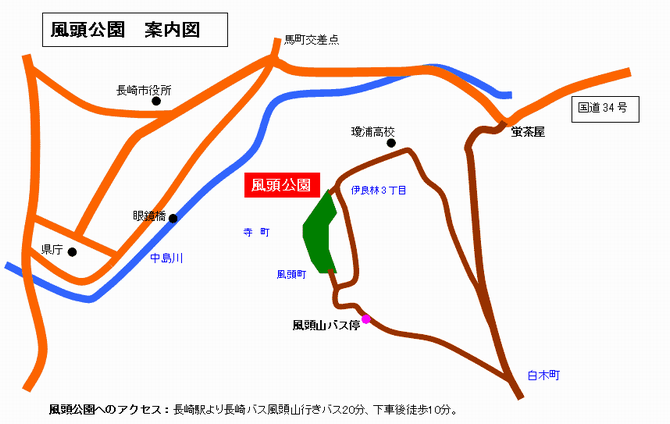 長崎駅より長崎バス風頭山行き風頭山バス停まで20分、下車後徒歩5分。