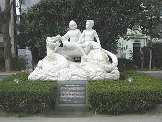 昭和57年7月23日、長崎の街は想像を絶する集中豪雨により、死者、行方不明合わせて262人という大惨禍を受け、美しかった中島川石橋群も6橋が流失し、3橋が半壊しました。この碑は、中島川に石橋を架けるなど古くからゆかりの深い中国に依頼して製作した水害復興記念碑です。像は、不思議な能力を持った伝説上の中国の少年と元気な日本の少女が力を合わせて、風を呼び雨を呼ぶ巨大な龍を従わせている姿で、治水と日中の友好を象徴しています。