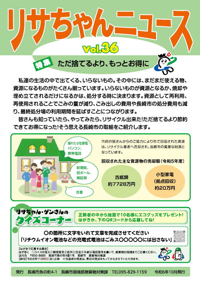 ごみの分別やリサイクルに関する啓発チラシ「リサちゃんニュースvol.36」を作成しました。ぜひご覧ください。