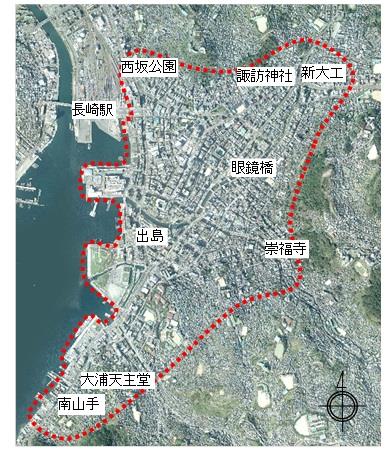 西坂公園・新大工・南山手に囲まれた、歴史や文化、商業・業務・サービスなど都市機能が集積する面積約240haを「まちなか」と定めています。