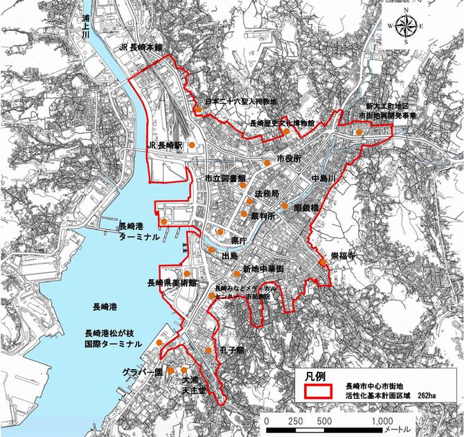 「陸の玄関口」である長崎駅周辺と「海の玄関口」である松が枝周辺、新大工から浜町を経て大浦に至るまちなか軸を中心とする262ヘクタール