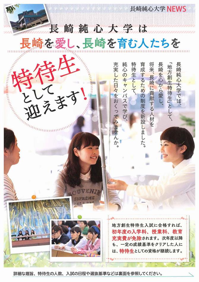 長崎を心から愛し、将来、長崎に貢献する人材を育成するため、「地方創生特待生」入試制度を新設したものであり、合格すれば、初年度の入学料、授業料、教育充実費が免除となるもの。