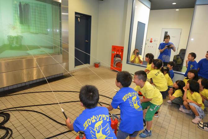 小学1年生から3年生までの194人が、ストップ・ドロップ&ロール(衣服に火が付いた時の消火方法)や「消防かるた」また、防災用品制作や8階の防災体験ひろばにおいて各種体験、初期消火体験や煙が発生した部屋から安全に避難する方法など、たくさんの事を学びました。