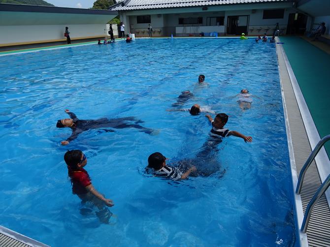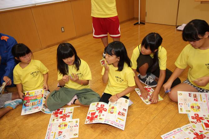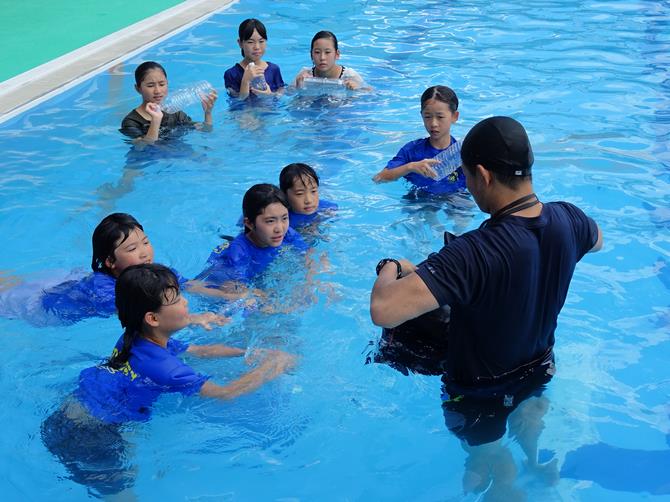 4年生から6年生の88人が、川や海などで事故に遭わないように身を守る方法を消防局の水難救助隊員から学びました。服を着たまま泳ぐむずかしさや、身近なものを「浮き」に使う方法、また、溺れた人を安全に救助する方法などを真剣に楽しく学びました。