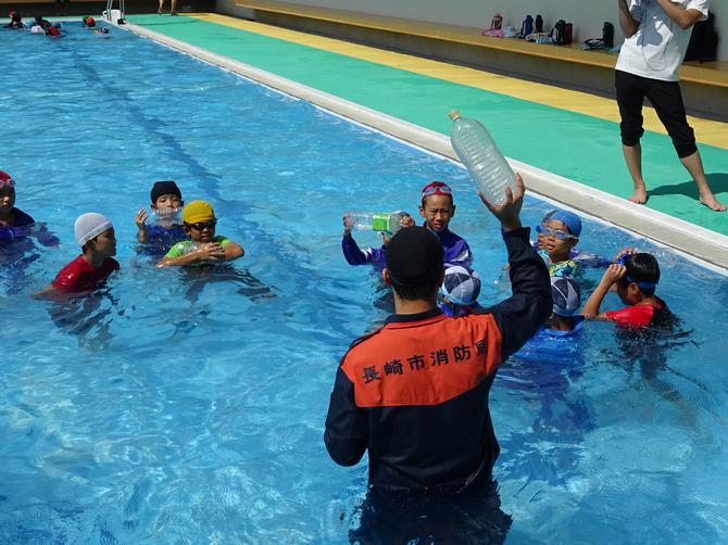 7月31日(水曜日)に、興善町にある消防局では「火事や地震について学ぼう!」、そして片淵中学校において「水事故防止体験学習」を開催しました。