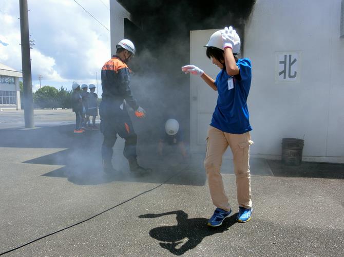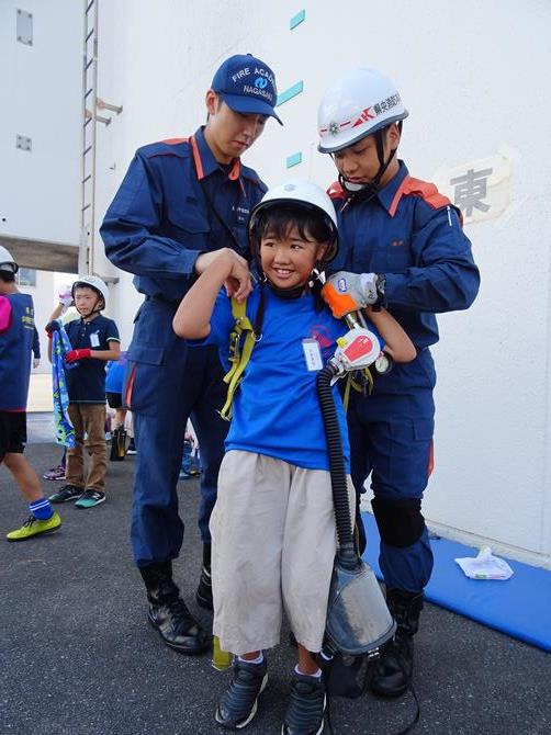 県内の他の少年消防クラブからもたくさんのクラブ員たちと共に、現在消防学校に学生として入校している新人消防士さんの指導のもと、消防の仕事や火災の予防についての寸劇や、放水やロープ渡り、濃煙体験、またロープの結び方などを楽しく体験しました。