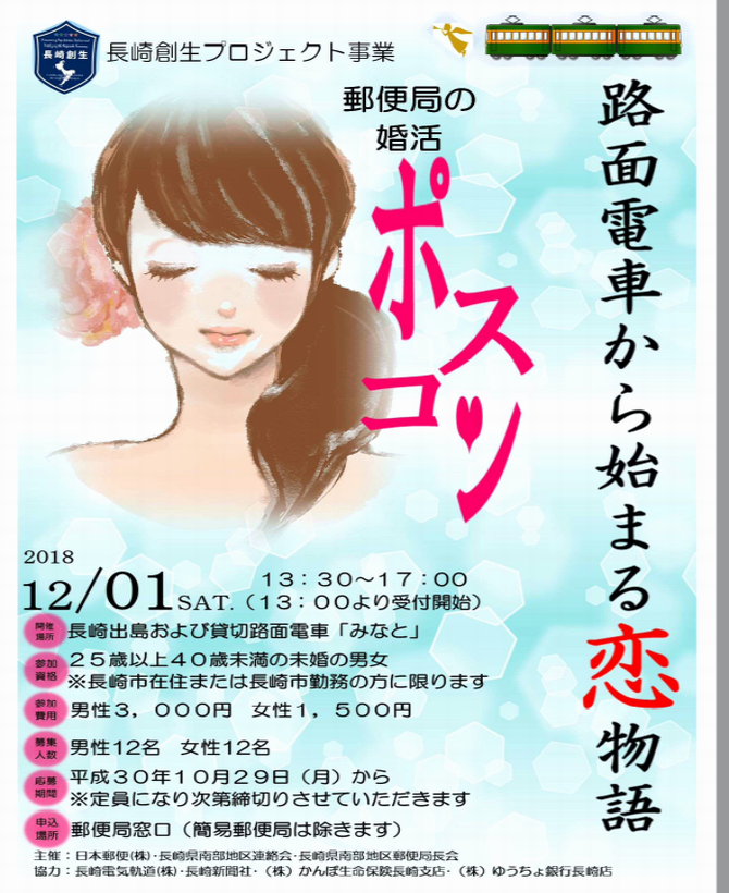 地域コミュニティに根差した郵便局の特性を生かし、申込受付から実施運営までを郵便局が独自に行うほか、出会いの会場として路面電車「みなと」を活用し、出島などを巡りながら、参加者に長崎の魅力を体感してもらう機会も併せて提供するもの。