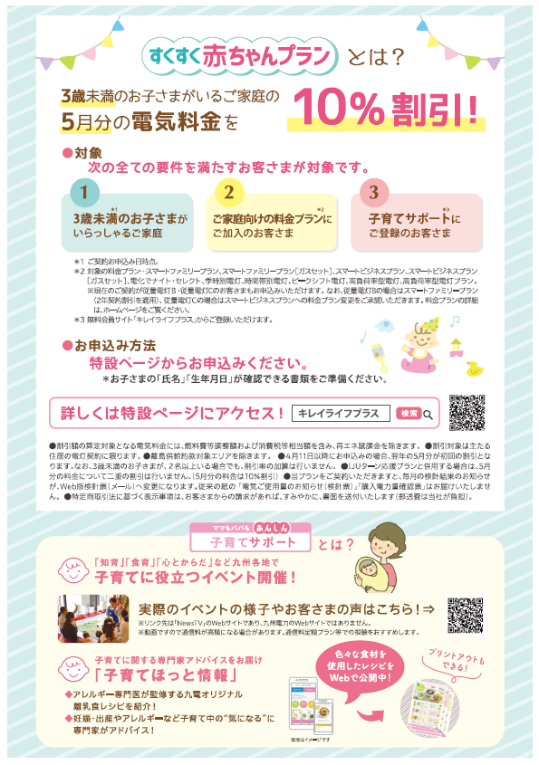 3歳未満の子どもがいる家庭を対象として、「こどもの日」にちなんで5月分の電気料金を割引きするサービスを実施し、子育て家庭の経済的負担の軽減を図ることで、子育て環境の充実へ寄与するもの。