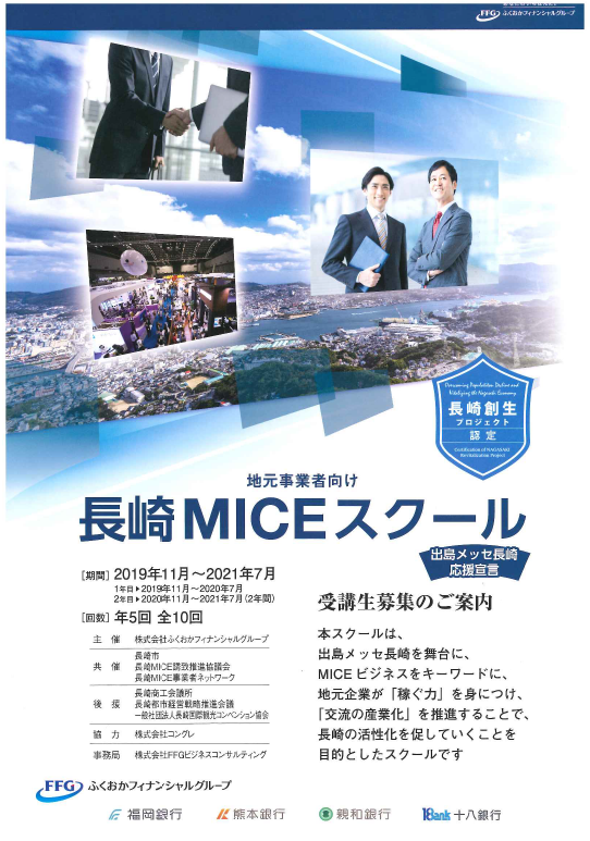 2021年11月に予定している出島メッセ長崎の開業をビジネスチャンスとして、MICEビジネスをキーワードに、地元企業が「稼ぐ力」を身につけ、地域経済の活性化、ひいては、「交流の産業化」のエンジン役となる「長崎MICEスクール」を企画、運営するもの。