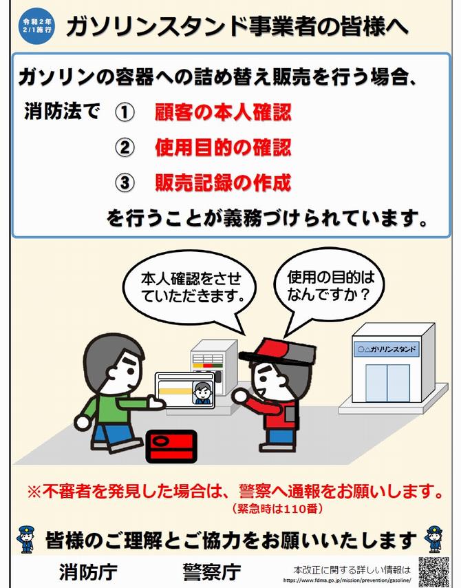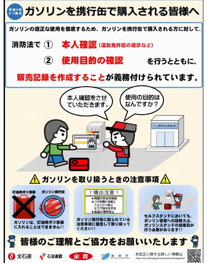 令和元年12月20日に危険物の規制に関する規則の一部を改正する省令(令和元年総務省令第67号)が公布され、ガソリンを販売するため容器に詰め替えるときは、顧客の本人確認、使用目的の確認と販売記録の作成を行うこととされました。(令和2年2月1日施行)
