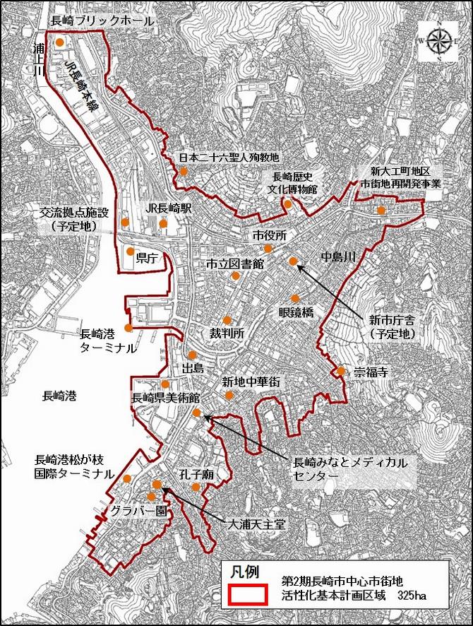 「陸の玄関口」である長崎駅周辺や民間開発の検討が進む幸町周辺から「海の玄関口」である松が枝周辺、さらに、新大工から浜町を経て大浦に至るまちなかエリアを含む325ヘクタール
