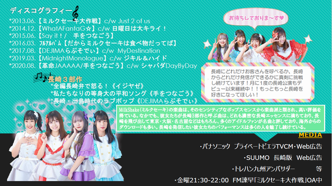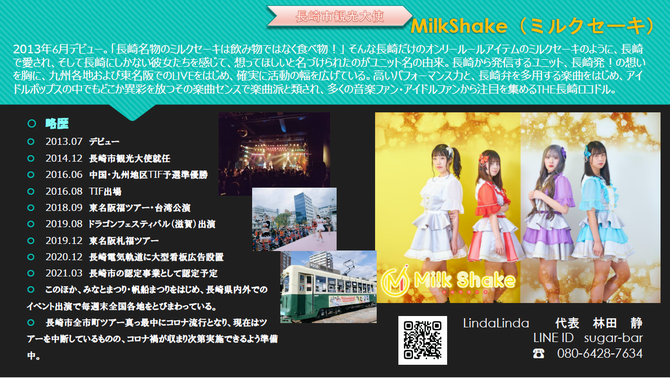長崎アイドル「MilkShake」が、長崎を拠点とするアイドル活動として、長崎にまつわる楽曲を制作するとともに、長崎市内をはじめ全国各地でのライブ公演の実施やSNSによる情報発信、また、コロナ禍において全国での公演が困難である中、ライブのWeb講演を行うなど、多くのツールを駆使しながら、域内外へ長崎の魅力や情報を発信する。