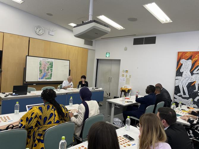 令和5年度国連軍縮フェローシップでは、24か国の若手外交官など24名、と国連随行職員2名の計26名が参加しました。長崎原爆資料館などの視察、被爆者などとの懇談、築城昭平さんによる被爆体験講話の聴講、そして平和活動に取組む長崎大学核兵器廃絶研究センター(RECNA)中村桂子准教授と大学生との意見交換などを行い、長崎の被爆の実相に触れるとともに、核兵器廃絶に向けた長崎での取り組みについて理解を深めていただきました。
