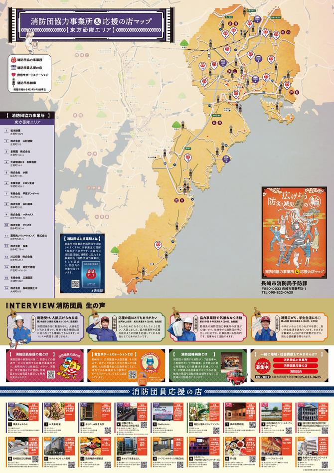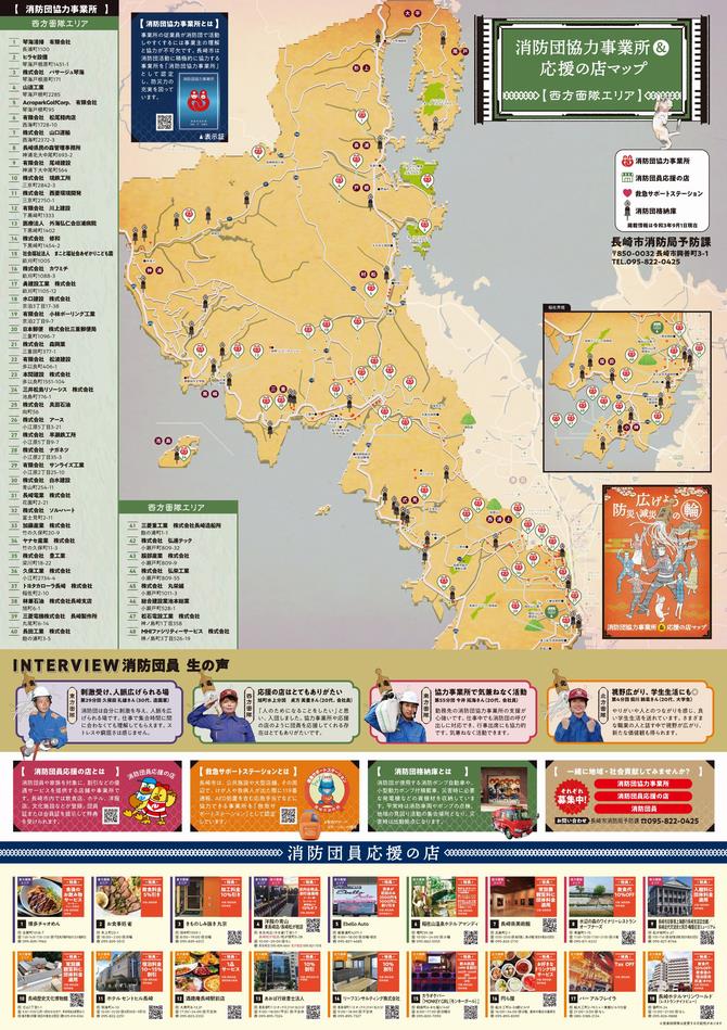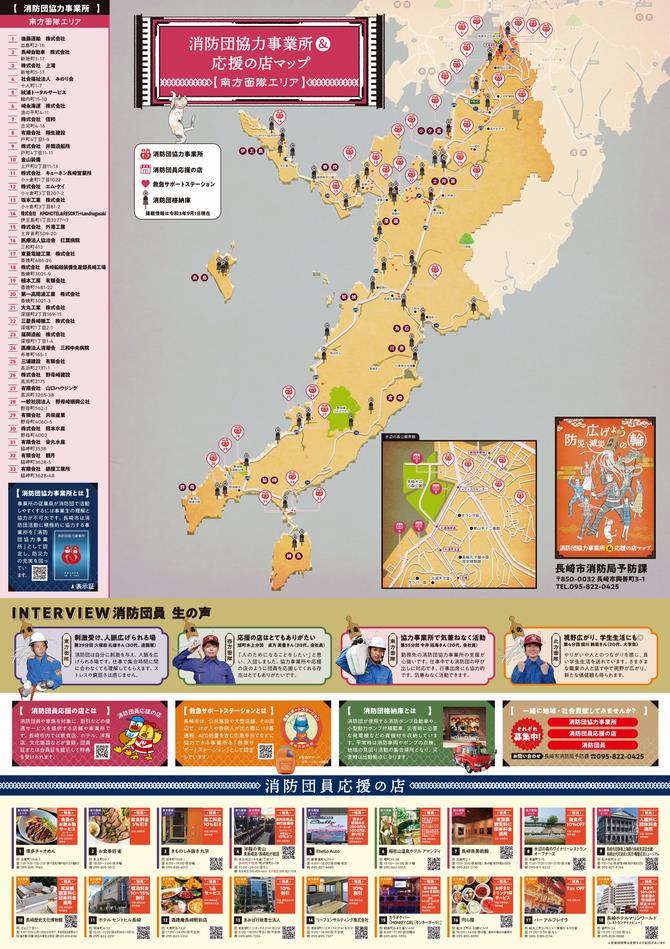 長崎市消防団の活動に積極的に協力している事業所(消防団協力事業所)をより多くの市民に知ってもらうために、長崎市を4つのエリアに分けた「消防団協力事業所&応援の店マップ」を制作しました。 このような地域貢献している事業所が増えることにより、消防団員が活動しやすい環境づくりを目指します。 消防団協力事業所の詳細についてはこちら→消防団協力事業所