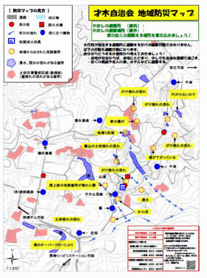 こうしてできあがった地域防災マップを地域に配布することで、地域に起きた過去の災害の周知やそれぞれの家庭で避難ルートを確認、検討する機会を作ることができます。