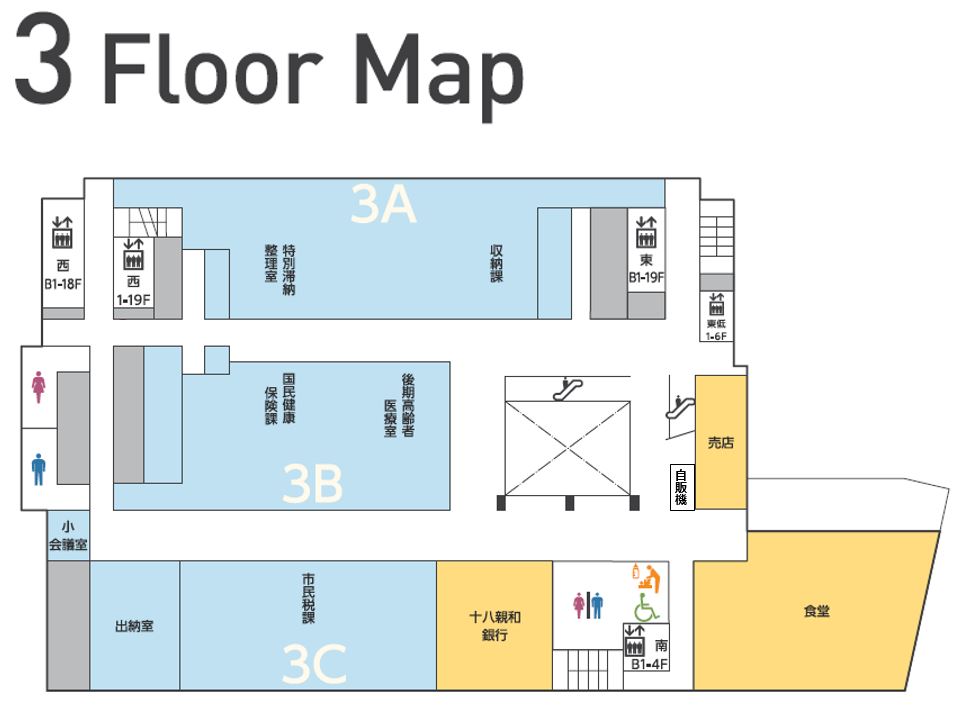 市民税の窓口、税の納付・相談、医療保険の窓口、食堂、売店、十八親和銀行(支店・ATM)、自販機 |