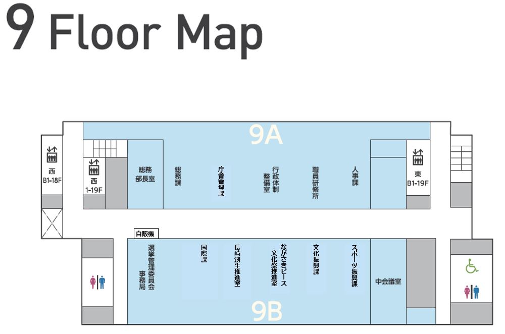 9階 | /市民生活部 | 選挙管理委員会事務局 / 文化振興課 ながさきピース文化祭推進室 スポーツ振興課 | 自販機 |