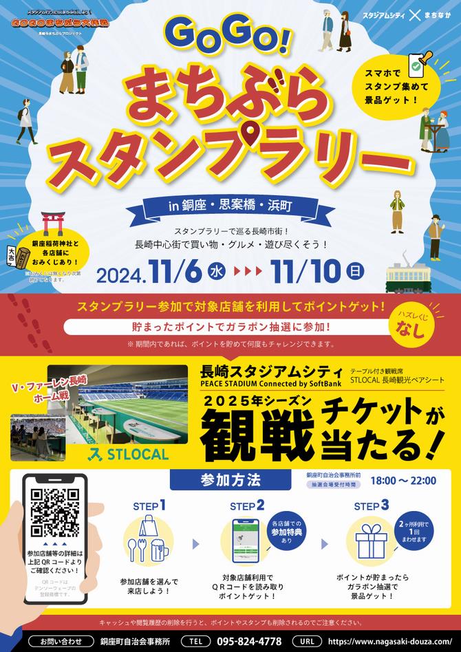 令和6年11月6日(水曜日)~令和6年11月10日(日曜日)に銅座・思案橋・浜町にて、参加店舗を巡るスタンプラリー及びV・ファーレン長崎の観戦チケットが当たるお楽しみ抽選会を実施し、多数の方に楽しんでいただきました。