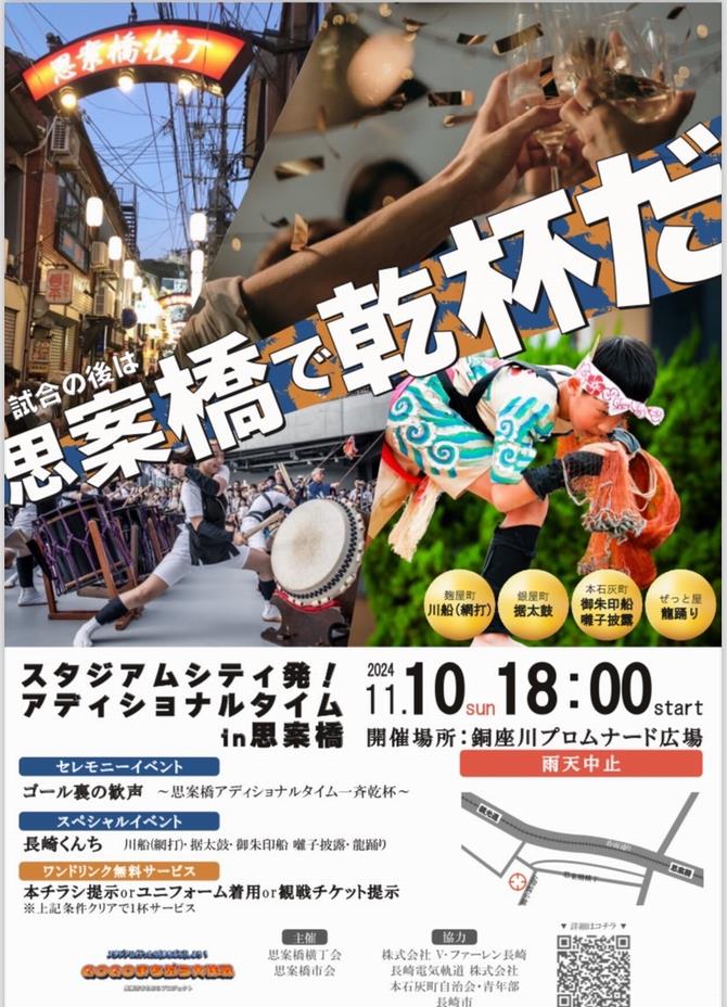 令和6年11月10日(日曜日)に銅座川プロムナード広場にて、サッカーJ2リーグ「vs愛媛FC戦(ホーム戦)」の後、イベントを開催し、約100名の来場がありました。長崎くんちの演出や試合ハイライト実況、据太鼓演奏が行われ大いににぎわいました。