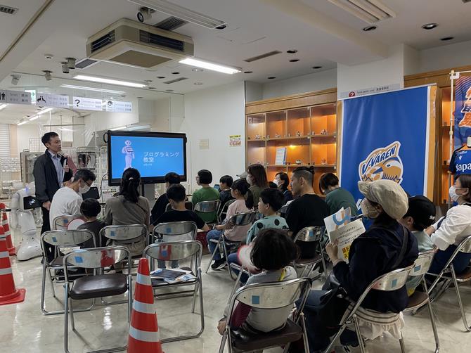 令和6年4月27日(土曜日)に浜んまちガーデンにて、人型ロボットのPepper君を使ってV・ファーレン長崎にエール送るためのプログラミング教室を開催し、多くの親子連れでにぎわいました。プログラミングしたPepper君を動画撮影し、後日のホーム戦で撮影した応援動画をスタジアムのビジョンで放映!プログラミングを作成してくれた子どもたちをスタジアムに招待しました。