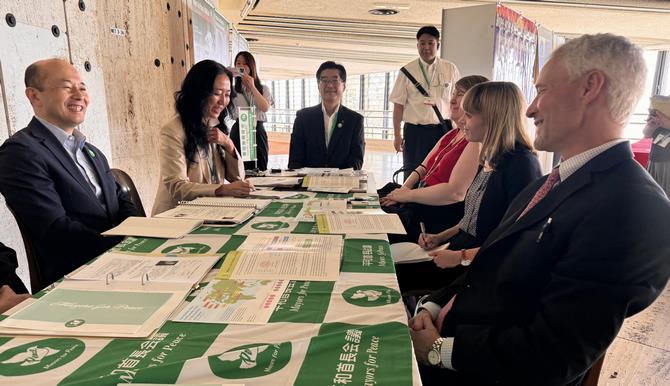 カザフスタン外務副大臣でもある議長に、同国内における加盟拡大への協力等、今後の更なる連携強化をしていきたいことを伝えたところ、国レベルで核軍縮に取り組むことも重要だが、市民社会からのインプットも非常に重要となるので、これからも平和首長会議の活動に協力していきたいと応じられました。