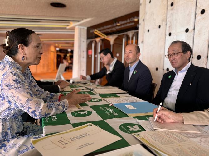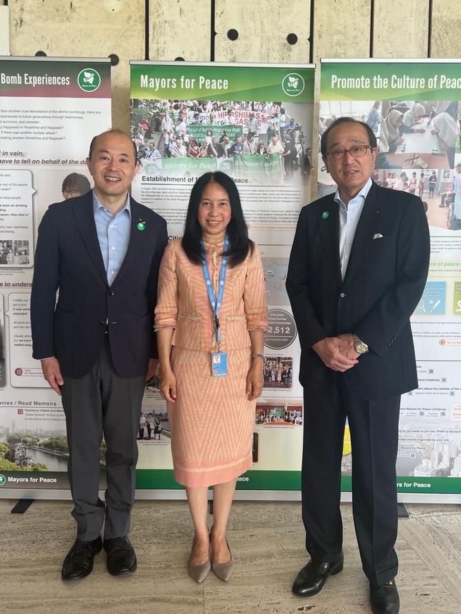 厳しい国際情勢の中で開催される今回の準備委員会に対する期待を伝えたところ、議長からは、「複数の国が、相手の国を名指しで非難しており、非常に厳しい状況にあるが、私たちは、このプロセスにおけるさまざまな利害関係者の懸念を軽減するために最善を尽くす」と述べられました。そして、「都市には市民がいて、教育や文化、その他多くの場面で、核軍縮の必要性を伝えることができる。それは核軍縮を進めるうえで、非常に重要な都市の役割だ」と話されました。
