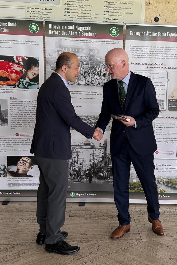 国連欧州本部内の常設原爆展の展示延長決定について謝意を伝えるとともに、核兵器リスクが高まっている中、被爆の実相を伝えることの重要性がますます高まっていて、国連欧州本部での常設展示は大切な役割を果していることから、引き続き原爆展示の常設展示への協力をお願いしました。