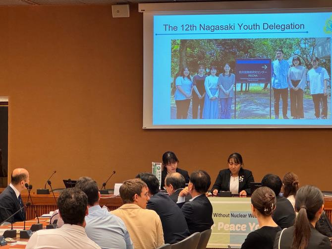 「Bring Your Piece of Peace for Dialogue-With Nagasaki Atomic Bomb Exhibition @UNOG―」と題したナガサキ・ユース代表団12期生が主催するNGOサイドイベントでは、長崎の被爆の実相を伝える原爆ポスターとナガサキ・ユース代表団の活動を紹介するポスター展示を鑑賞し、平和について考え、意見交換を行うことを目的に開催されました。