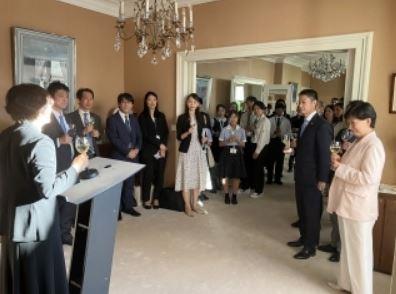 市川軍縮会議日本政府代表部特命全権大使公邸で開催されたレセプションでは、中満国連事務次長、高村外務大臣政務官等の出席の下、ナガサキ・ユース代表団、平和首長会議ユースやジュネーブ市の学生が招待され、参加した若者同士での交流を深めました。(写真:外務省)