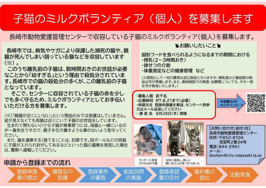 そこで、センターに収容されている子猫の命を少しでも多く守るため、ミルクボランティアとしてお手伝いいただける方を募集します。